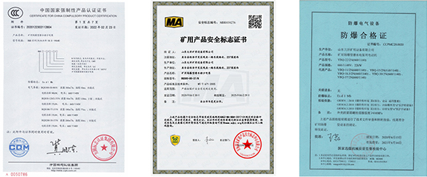 产品经国家煤矿防爆安全产品质量监督检验中心检验合格,并颁发了“防爆合格证”和安标国家矿用产品安全标志中心发放的“矿用产品安全标志证书”,以及方圆标志认证集团颁发的 中国国家强制性产品认证证书(3C)。